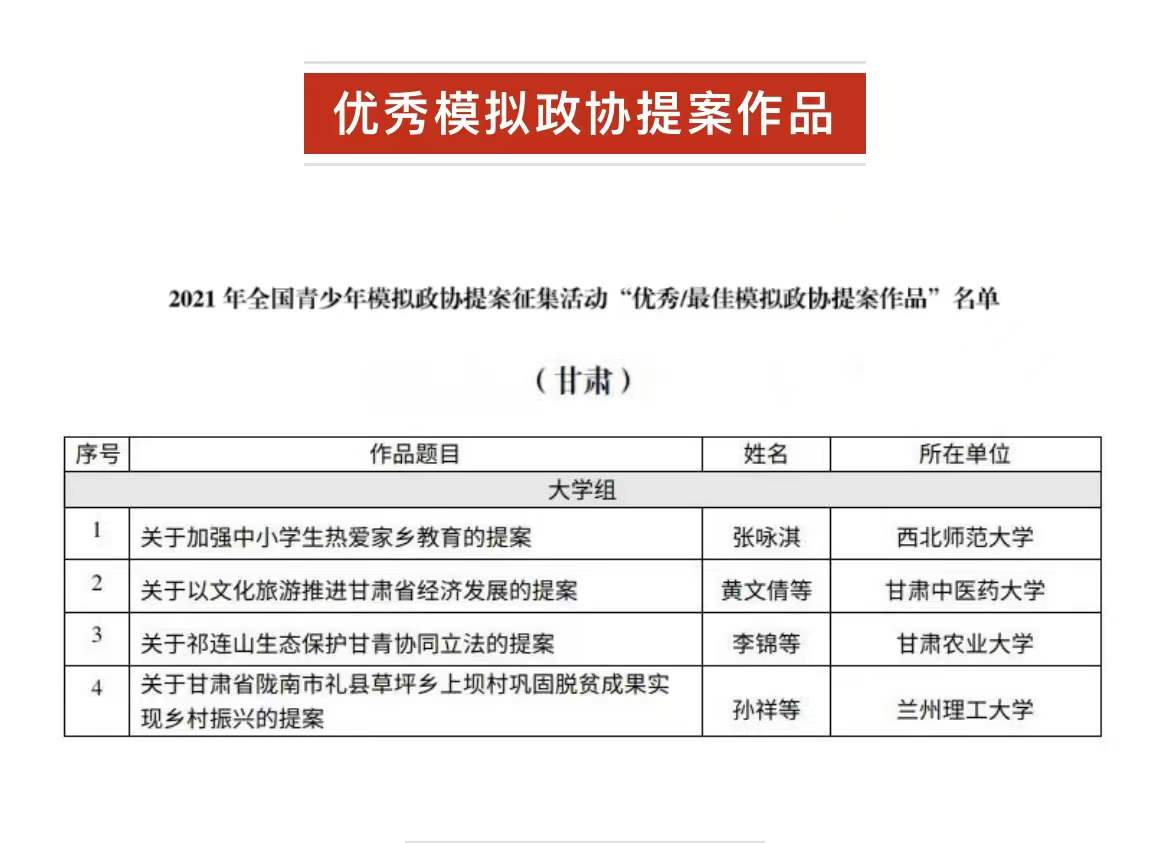 近日,由共青团中央维护青少年权益部、中华全国学联秘书处共同开展的2021年全国青少年模拟政协提案征集活动圆满落下帷幕,我校经济管理学院孙祥等4名同学提交的“关于甘肃省陇南市礼县草坪乡上坝村巩固脱贫成果,实现乡村振兴的提案”被评选为“优秀模拟政协提案作品”。