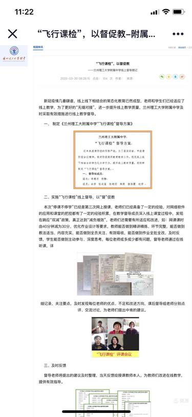 为了更好地保障线上教学的顺利开展,学校积极迎接市教育局组织的督导和飞行课检,根据督导和飞行课检反馈的意见认真整改,优化提升在线教学品质。同时学校线上教学视导督导小组常态化组织在线课堂督导视导,督导过程中及时发现问题及时反馈,指导任课教师改进在线课堂,做好自查自纠。定期、不定期组织线上教学督导总结会,针对各级部、各班线上教学督导中发现的问题,及时予以整改,分享线上教学的好方法和好做法,以此来帮助老师提高教学效率,助力学生提高学习成效。