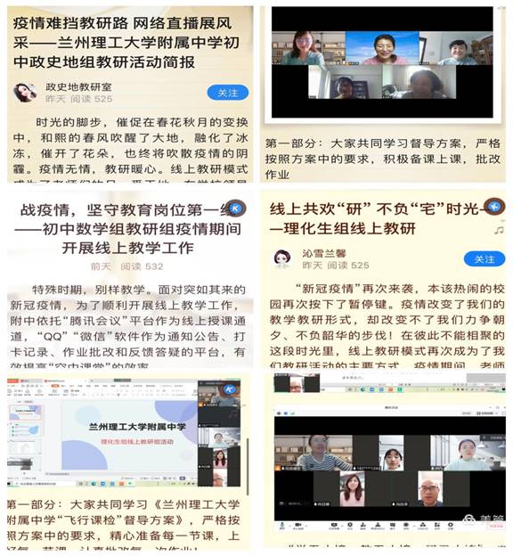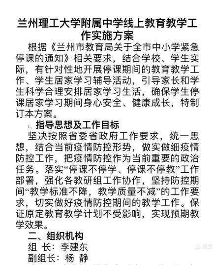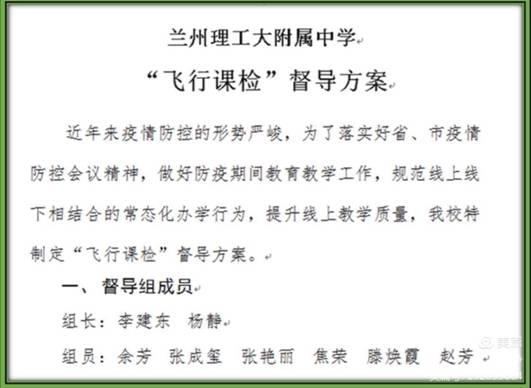 自疫情发生以后,学校领导科学谋划,提早研讨拟定《兰州理工大学附属中学线上教育教学工作实施方案》和《兰州理工大学附属中学“飞行课检“督导方案》,为可能出现的居家防疫做好停课不停学的预案。接到教学活动全部转线上通知后,学校在线教学领导小组立即启动方案,全面部署线上教学相关工作。各级部门按照学校要求迅速行动,对线上教育教学工作周密部署、合理安排,总务处快速行动确保学习资料安全顺利送达学生手中,中教处积极为教师准备设备,第一时间做好平台调试,在校领导的统一指导下,各处室和各级部协同配合,学校线上教学迅速启动,各项教育教学活动在线上有序展开。