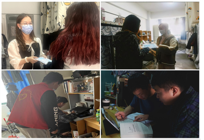 各级网格员配合辅导员,带头组织各层学生有序进行核酸检测;定期检查本楼层的宿舍卫生,保持宿舍卫生干净整洁,让大家在疫情中也保持良好的学习环境;定期为班级同学分发口罩等抗疫物资,扎实做好疫情防控工作,使同学们在闭环管理的日常生活中更加安心;积极配合学校要求,每日上报各宿舍具体情况,确认学生健康码状况,夜间报寝情况等,做好表格登记工作,让抗疫常态化工作更加规范。