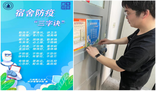 校内各辅导员全员上阵,全天候待命,积极组织学生完成核酸检测以及日常事务管理。由于校园封闭管理的特殊情况,所有校内辅导员下沉学生宿舍,主动与重点学生群体谈心谈话,了解学生在封校期间的思想状况,加强网课上课纪律并督促宿舍卫生情况。此外,经济管理学院学生工作办公室主动作为,集体创编“防疫三字诀”海报并张贴于各学生宿舍,引导学生科学防疫。