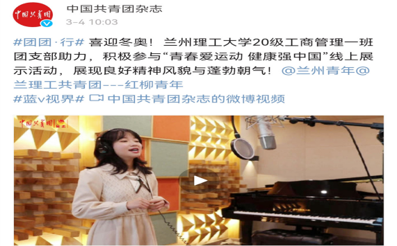 ①经济管理学院2020级工商管理团支部助力冬奥社会实践活动“我为冬奥加油”MV视频被《中国共青团》杂志官方微博推广宣传,展现了兰理共青团红柳青年蓬勃向上的精神风貌。