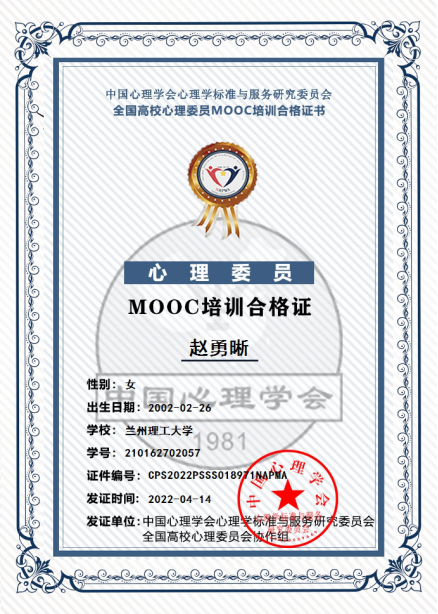 为进一步加强心理委员队伍建设,提升心理委员的胜任力,3月-4月,校团委、心理健康指导服务中心组织我校2021级班级心理委员以及部分宿舍心理联络员参与由中国心理学会心理学标准与服务研究委员会、高校心理委员协作组共同开发的心理委员MOOC培训课程,经过学习和测试223名学生全部取得高校心理委员MOOC合格证书。