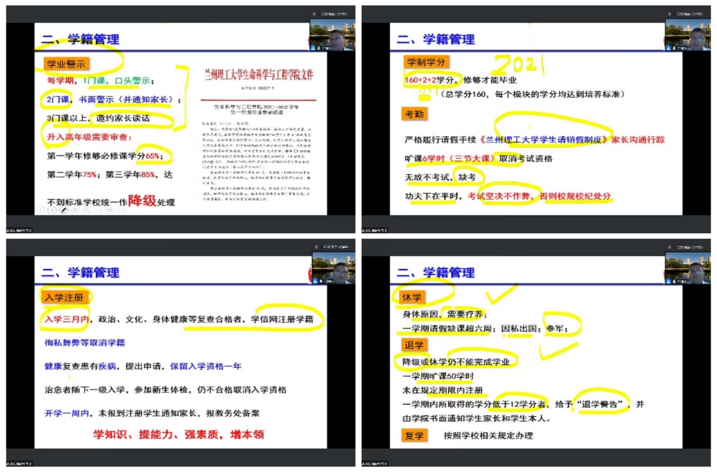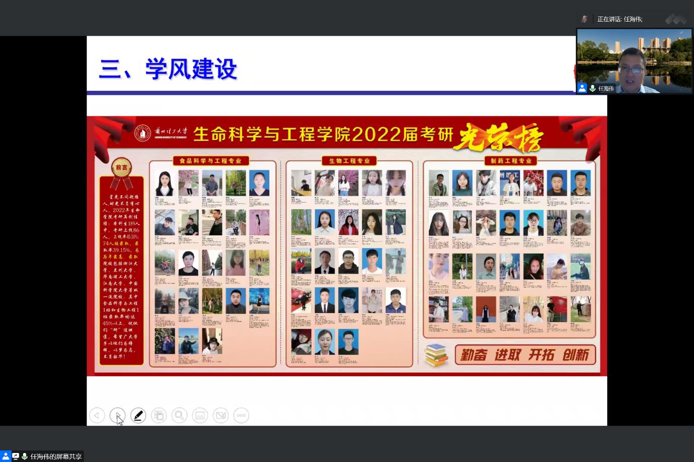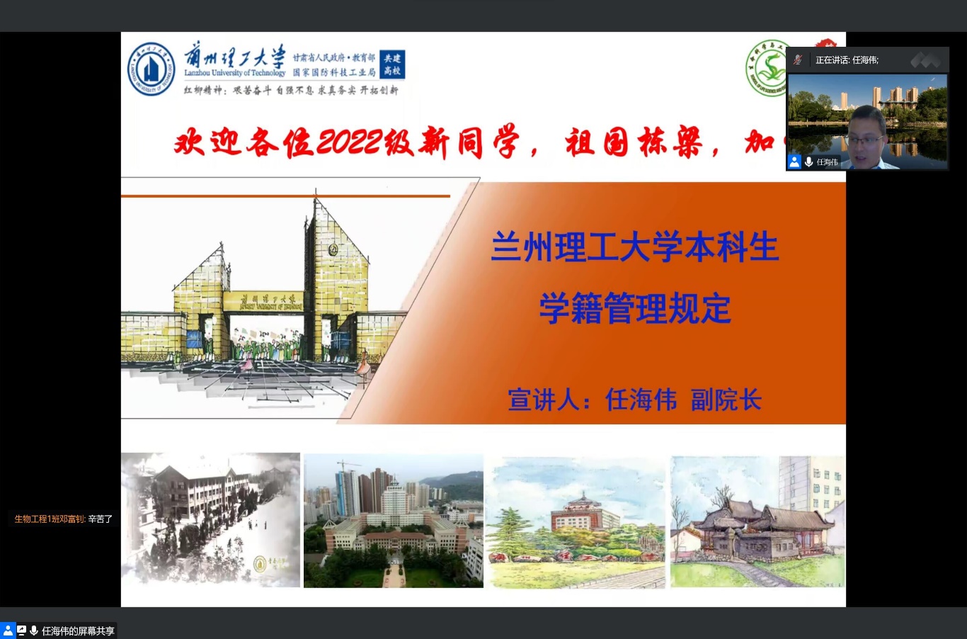 11月2日晚,生命科学与工程学院通过腾讯会议在线上举办了“2022级新生入学教育之学籍管理制度和创新创业教育专题”讲座活动。本次入学教育专题由学院副院长任海伟教授主持,全体2022级全体新生和班主任老师参与了本次入学教育活动。