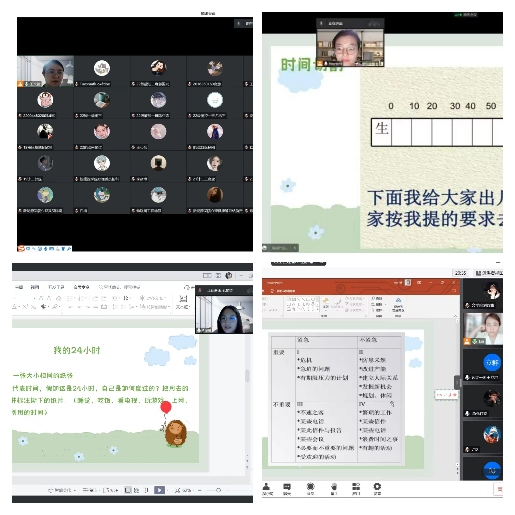 沙龙在轻松愉快的氛围中进行,心理老师通过一分钟拍手游戏、“我的24小时”等活动让同学们感受时间,明晰自身当前时间应用的现状,接着引导大家找到自身“偷走时间”的因素,探讨自身的时间观念以及在时间管理过程中存在的问题,最后,老师们从心理学视角入手,提供了清晰价值观并设立合理的目标、按重要程度和紧急程度排列优先次序、有意识规划自己的时间、制作时间馅饼图等管理时间的方法,鼓励大家珍惜青春,珍惜大学时光,结合自身实际情况建立科学合理的目标,有效管理时间不断努力实现自身的目标。整个沙龙过程氛围良好,师生进行了良好的互动。