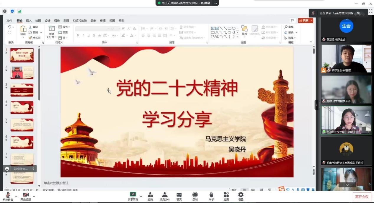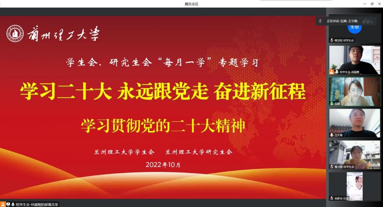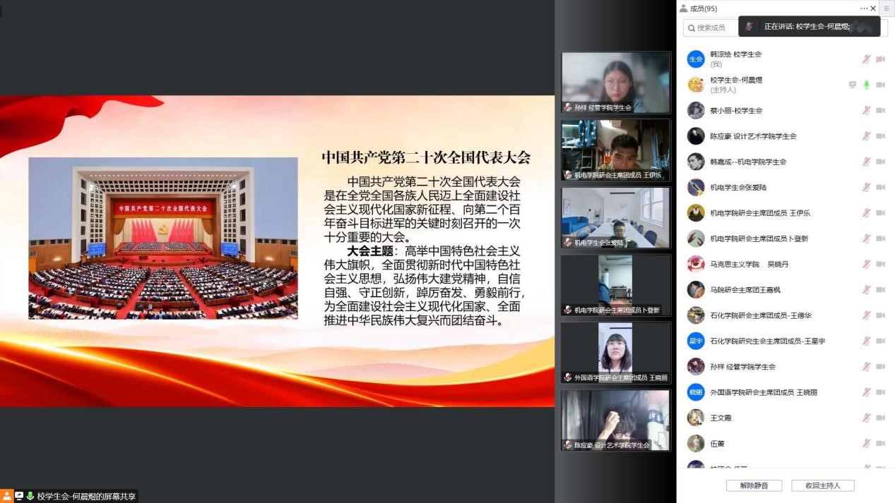 10月18日晚,校学生会、研究生会“学习贯彻党的二十大精神”专题学习会在线上开展,校团委副书记王文霞、张晓锋,校院两级学生会、研究生会主席团成员参会,会议由校团委伍蕾老师主持。