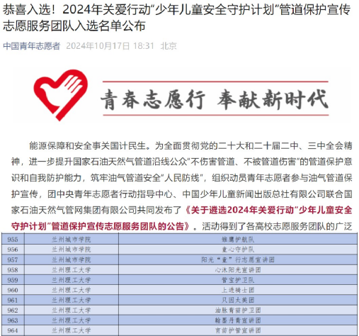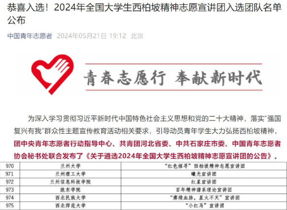 今年3月“红色薪火”宣讲团入选“井冈山精神”宣讲团,5月“曦光”宣讲团入选“西柏坡精神”宣讲团,11月“铸魂”宣讲团入选“遵义会议精神”宣讲团。此外,今年5月,学院爱心支教协会组建的“芳瀚”宣讲团入选“中国历代绘画大系”宣传团,11月份“心沐阳光宣讲团”入选“少年儿童安全守护计划”管道保护宣传志愿服务团队。
