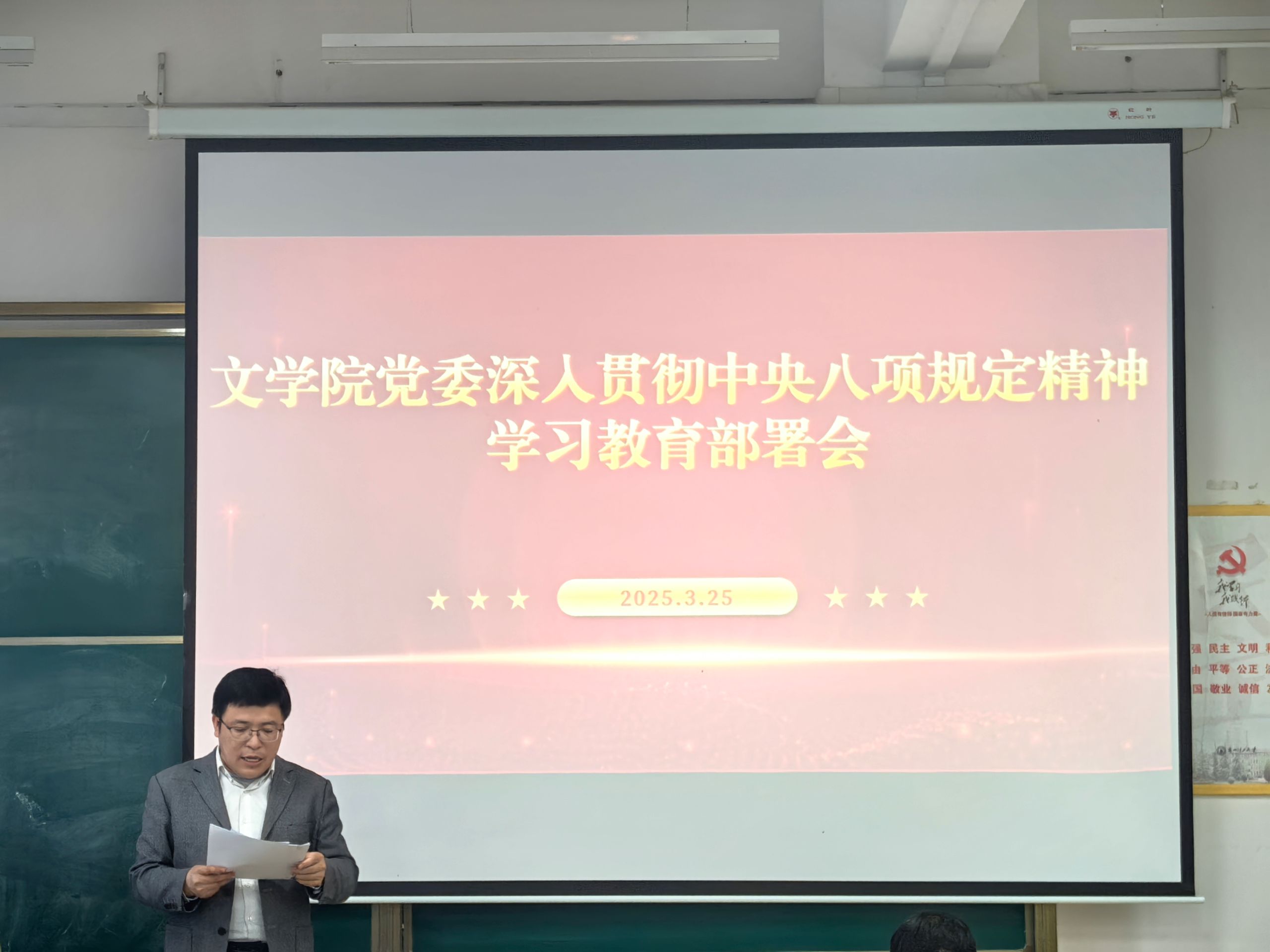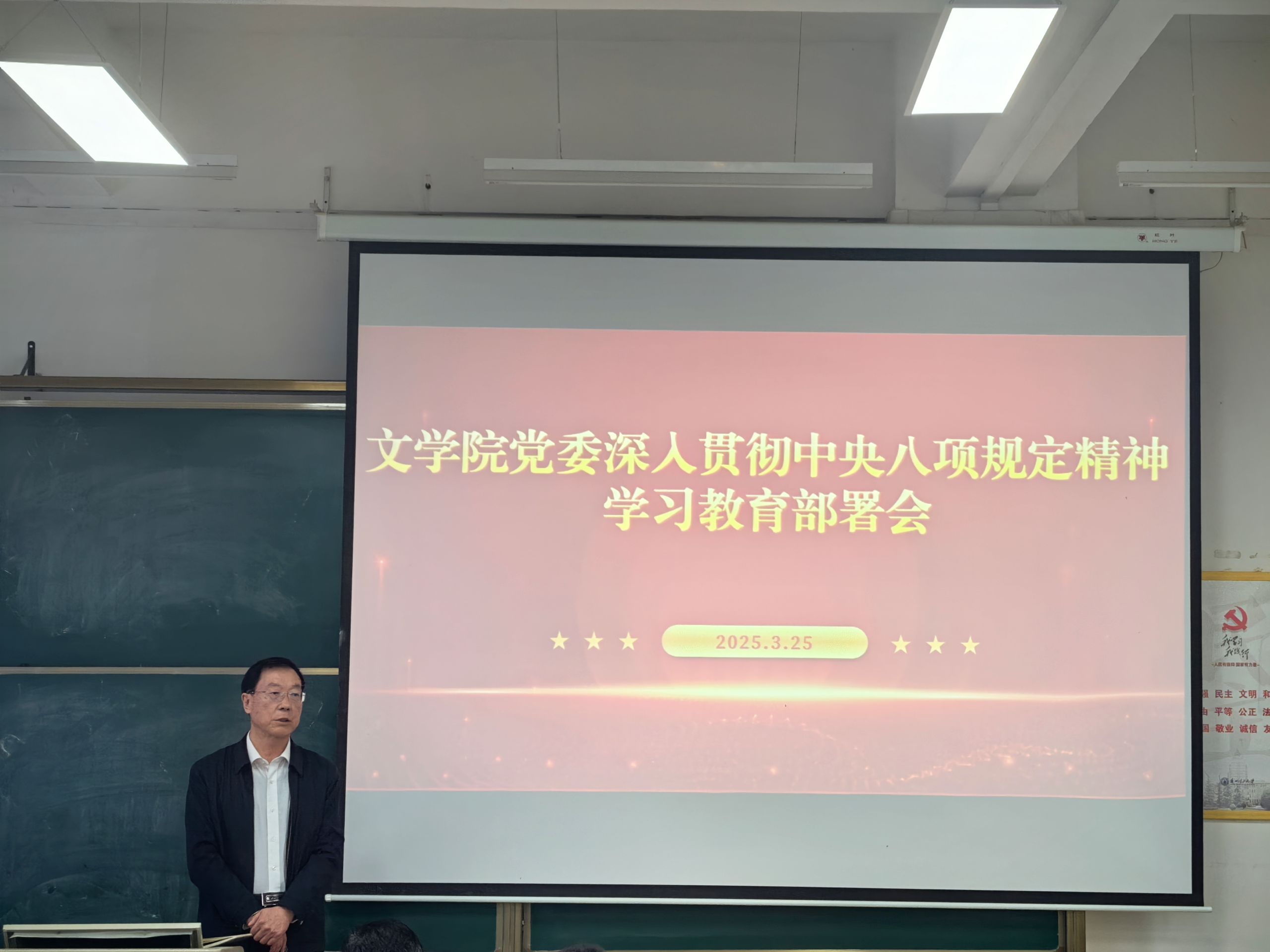 3月25日,文学院在观成楼103教室召开了深入贯彻中央八项规定精神学习教育部署会,传达学习了中央及省委和学校党委关于深入贯彻中央八项规定精神学习教育的相关精神,正式启动安排了学院党委深入贯彻中央八项规定精神学习教育工作。会议由学院党委书记张浩辰主持,学院全体党员参加了会议。