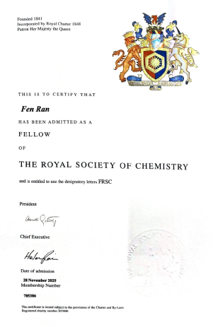 12月18日,英国皇家化学会(Royal Society of Chemistry,RSC)发来贺信,兰州理工大学冉奋教授在化学、材料和交叉领域做出卓越贡献,当选为英国皇家化学学会会士(Fellow of the Royal Society of Chemistry, FRSC)。