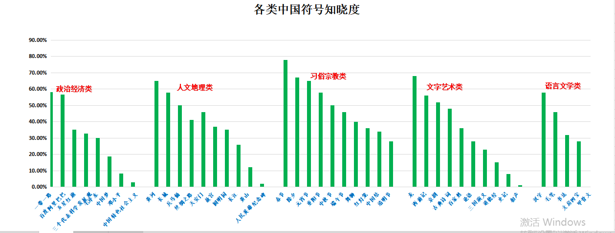 图1为各类中国符号知晓度调研数据统计表,柱状图显示,知晓度最高的一类为习俗宗教类,分析原因为马来西亚有众多华人居住,他们注重习俗宗教的传承和发扬;其次以人文地理类的黄河、文字艺术类的龙知晓度位居第二,分析原因为海外人更倾向接受直观性强、体验感强的文化符号。然而,对于政治经济类和古老的语言文字类,由于各种原因,海外人士并不主动了解或存在有误读、误解现象。