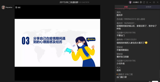 5月7日起,17级、18级、19级各班以“防疫抗疫”为主题,结合学院“5.25大学生心理健康教育月”活动陆续展开线上座谈会。各班心理委员通过演示PPT向大家介绍防疫抗疫小知识、播放抗疫短视频、以及同学们参与话题讨论等形式展开。在讨论区,同学们积极分享自己在疫情期间遇到的心理困惑及经历,心理委员及其他同学针对这些问题进行答疑解惑,营造出轻松的氛围,减轻了心理负担,同时增强了自我保护能力,树立了抗击疫情的信心。