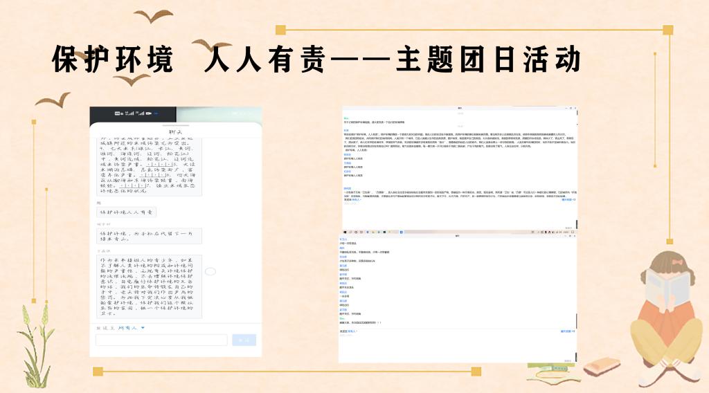有的团支部组织全体团员观看环境保护的纪录片,有的团支部一起学习垃圾分类,有的团支部分享自己的环保小习惯。通过此次团日活动,使学院全体青年团员增强了保护环境的责任感。