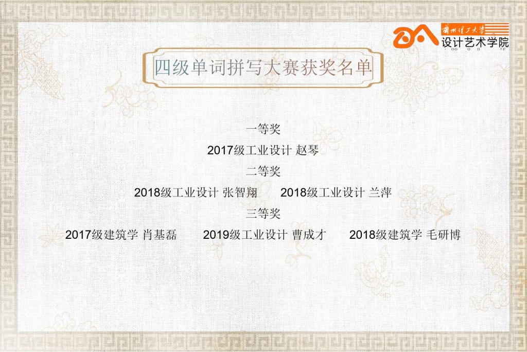 7月8日晚,设计艺术学院团委、学生会举办四级单词拼写大赛。受新冠肺炎疫情影响,2020年春季学期前半学期学生们在家进行线上课程学习。为充实学生在家的学习生活,我院开展单词打卡帮帮团活动,选拔英语学霸10人在线上监督同学们学习四级单词。通过打卡,学生们英语学习热情高涨。为了检验学生们的学习成果,夯实学生们在家记忆的单词,学院举办四级单词拼写大赛。大赛邀请外语学院教师出卷,共有200余名学生主动报名参加。通过比赛,评选出一等奖1人,二等奖2人,三等奖3人及优秀奖5人并发放奖励。