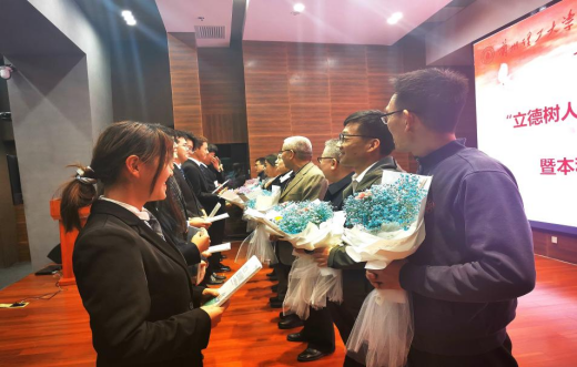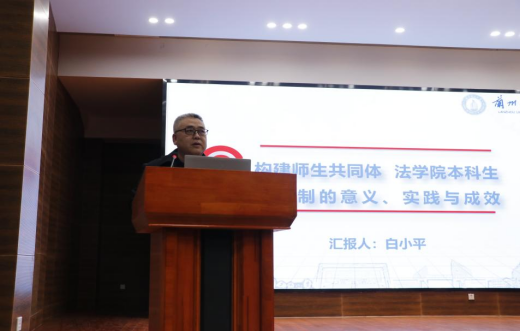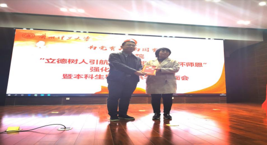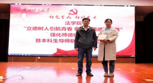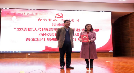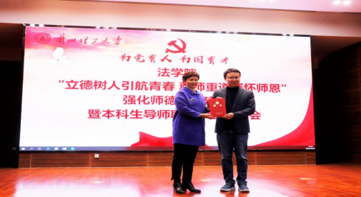 白小平首先介绍法学院本科生导师制,教师结合立德树人要求,以习近平新时代中国特色社会主义思想为指导,通过开展本科生导师制引导和帮助学生自迈入大学起把握好人生方向,扣好人生关键的第一粒扣子,构建“师生共同体”的实施意义与取得成效。袁峥嵘副教授结合担任本科生导师期间的学生成长分享感悟,对新任导师立德树人加强师德师风建设给予建议指导。2018级米笑萱同学代表高年级本科生感谢老师们“以身示范、以情感人、以言导行、以才育材”在同学们成长成才过程中给予的关怀帮助。并代表全体本科生发出“法学学子进一步推进学风建设倡议”。会上,导师代表接收学生“感恩心语”和鲜花,并向学生赠送书籍《成为更好的自己》。李香枫为新任导师欧俊颁发新任导师聘书和《习近平总书记教育重要论述讲义》读本;孙伟国、冯宜伟、学院领导分别为王静、王月、巨文姝、张生颖四位新任导师颁发聘书和《习近平总书记教育重要论述讲义》读本。