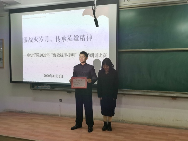 活动中,各参赛队伍紧紧围绕“致敬抗美援朝”比赛主题,重温历史、关注现实、憧憬未来,用优美的语言抒发着对祖国的热爱。他们用自己精彩的表现,表达出对抗美援朝中牺牲的革命英雄的崇高敬仰。最终,2020级电子二班凭借突出表现摘得桂冠。