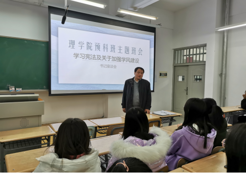 2020年12月3日下午,理学院在彭家坪校区集贤楼201教室召开了预科班学习宪法及加强学风建设为主题的书记座谈会。学院党委书记李建东、预科一班班主任巩纪军、新疆内派阿曼老师,预科一班、预科二班全体学生参加本次座谈会,由辅导员安星主持。