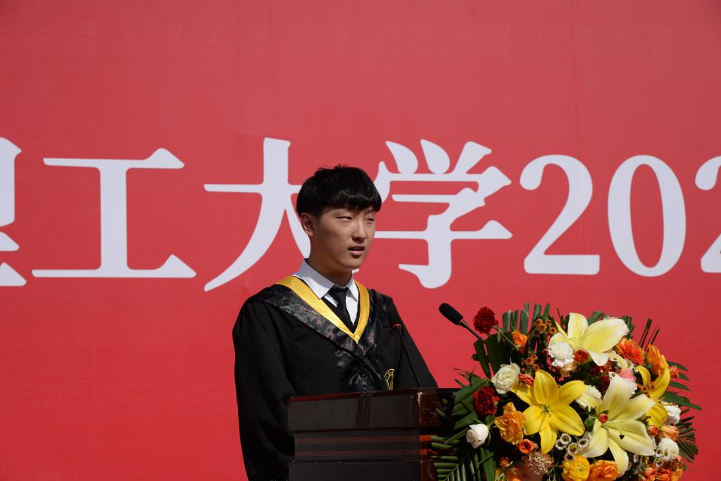 典礼上,2021届硕士毕业生代表牟淼、2021届本科毕业生代表赵石磊同学代表全体毕业生做了发言,表达了对全体毕业生在困惑时点亮指明灯,失败时给予勇气的老师、父母、朋友的由衷感谢和离别之情。号召全体毕业生绝不辜负母校和老师的辛勤培育,在“天高任鸟飞,海阔凭鱼跃”的时代大潮中,走好新长征路,书写属于2021届毕业生的锦绣华章。2018级高语阳同学代表全体在校学生对2021届毕业生表达了感谢并送上了毕业祝福,祝愿所有2021届毕业生用激情唱响青春的动人乐章,用才华绽放出人生的绚烂花朵,前程似锦,归来仍是少年。