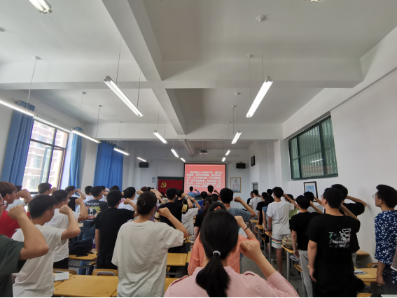 最后,全体与会人员面向鲜红的党旗,举起右拳,重温入党誓词,铿锵有力的宣誓声响彻教室,以铮铮誓词宣示对党的坚定信念和为党的事业奋斗终身的决心。