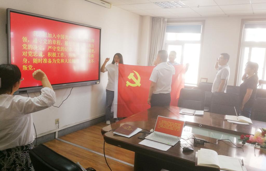在主题党日活动中,支部新发展党员周红伟同志宣誓,老党员重温入党誓词,并集体学习观看视频短片《回望历史》,短片回顾了我党从建立之初走到今天的光荣历程,党员教师深受启发和教育。