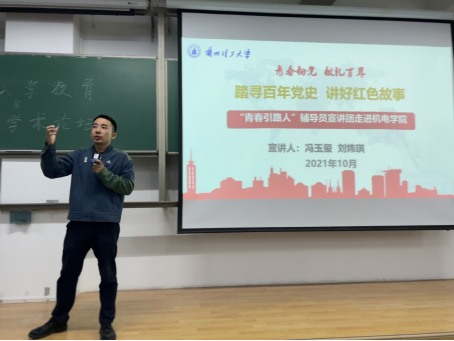 为引导广大学生坚定理想信念,在奋发有为中践行初心使命。10月10日晚,机电工程学院在彭家坪校区集贤楼208教室举行踏寻百年党史,讲好红色故事——“青春引路人”辅导员宣讲活动。学院2021级全体硕士研究生参加了本次活动,活动由辅导员冯玉玺主持。