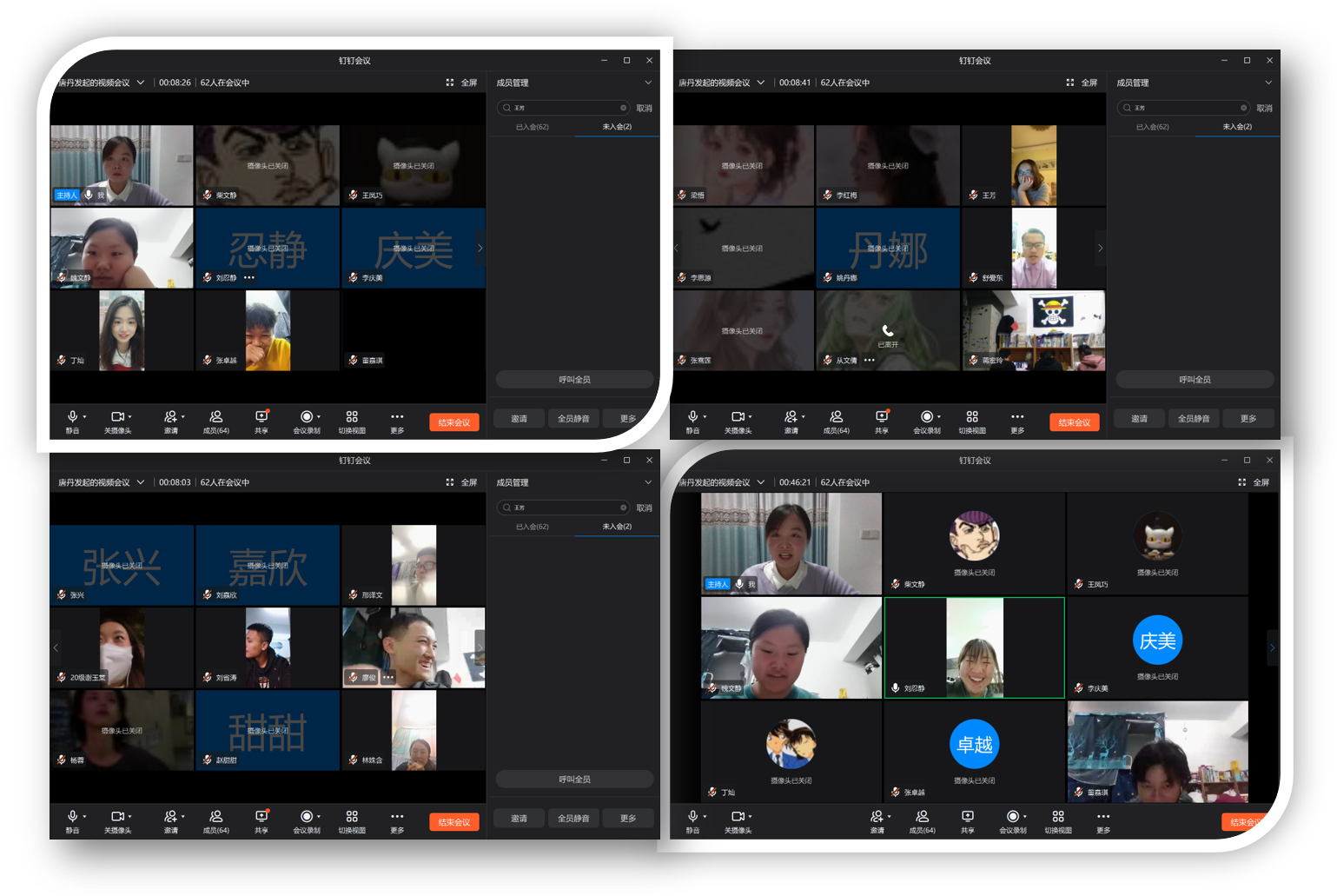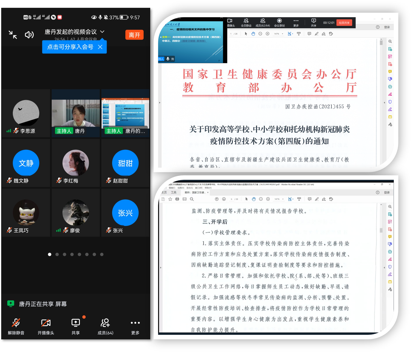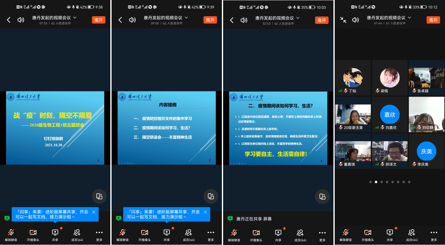 为了提高同学们封校期间疫情防控的警惕性,做到安全、正确的防控,丰富疫情封校期间同学们的精神生活,生命科学与工程学院20级生物工程一班于2021年10月30日晚上利用钉钉平台在线上召开“战‘疫’时刻,隔空不隔爱”疫情防控主题班会。参与本次班会的有20级生物工程班主任唐丹老师、王芳老师以及20级生物工程1班全体同学。