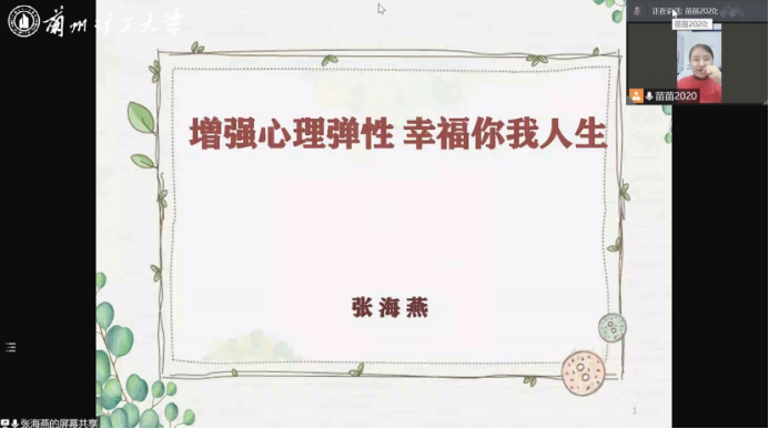 讲座不仅综合了疫情之下大学生心理健康现状的一系列问题,还针对心理弹性为大学生们提出了诸多的解决方法,有利于帮助同学们保持良好的心理状态,以积极健康的精神风貌助力疫情的防控。(撰文:许丹;终审:罗繁荣)