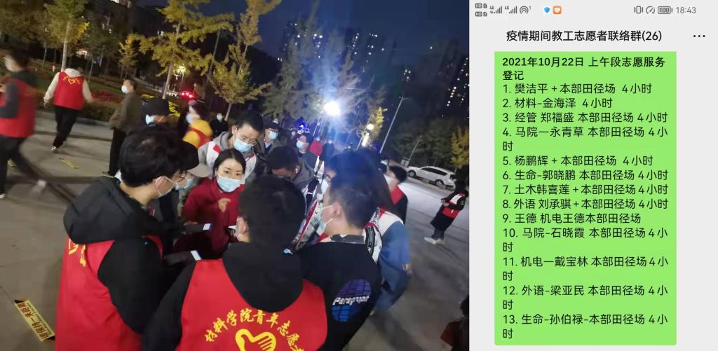 生命重于泰山,疫情就是命令。面对突如其来、形势汹汹的新冠疫情,10月22日生命科学与工程学院制药工程专业教工党支部宣传委员孙伯禄老师接到学校和学院通知安排后,立即投身于我校教职工第一轮核酸检测引导服务的志愿者行列,孙老师听从学校教职工志愿者服务队负责人安排,担任起引导员的工作。看似简单的工作,却也需要耐心和细心的服务,从引导大家按要求排队,如何出示健康码,如何尽快的扫码登记,到快速的听从医护人员的要求进行核酸咽拭子的采集,每一个环节都需要不停的重复告知前来做检测的教职工。
