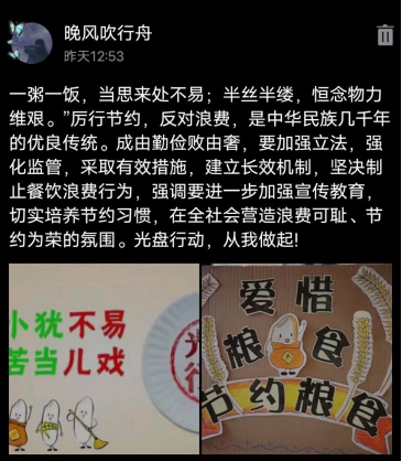 受疫情影响,本次活动依托线上评议选定,参与者于群内发表自身“光盘行动”活动照片,并可自行编辑文案,结合学校相关规定上传至流量平台进行“厉行节约,反对浪费”的宣传。活动受到了同学们的强烈关注,并纷纷晒出了自己的“光盘”照片。权益部为扩大活动影响力,号召更多的同学参与其中,还举办了“QQ空间集赞得礼品活动”,开通了关于厉行节约文学作品征稿渠道,有力地促进了“共创疫尘不染,同养勤俭节约之德”系列主题活动的顺利开展。