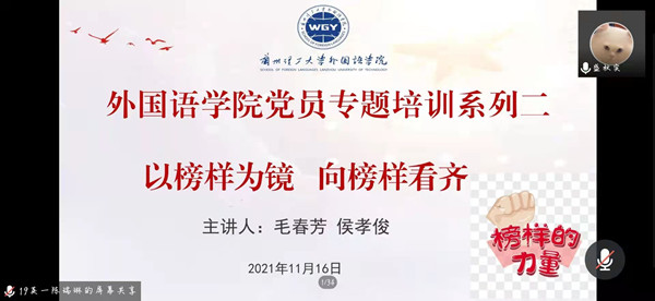 典型就是旗帜,榜样就是力量。11月16日下午,外国语学院党委举办“以榜样为镜,向榜样看齐”学生党员专题培训第二讲。学院学生党支部书记、全体学生党员共计145人参加培训,大学外语教师第2党支部奉献榜样毛春芳、大学外语教师第1党支部志愿服务榜样侯孝俊担任主讲。
