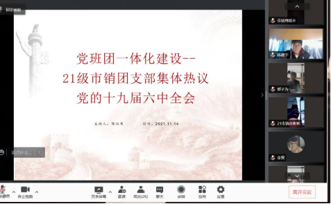 为深入学习贯彻习近平新时代中国特色社会主义思想,加强标准化规范化建设,不断提高党支部建设质量,落实党团班一体化建设,2021年11月18日下午兰州理工大学经济管理学院21级市销团支部在线上召开了主题为“党班团一体化建设--21级市销团支部集体热议党的十九届六中全会”的团日活动。本次活动由团支书郭双苇同学主持召开,同学们积极发言讨论学习党的十九届六中全会的精神。