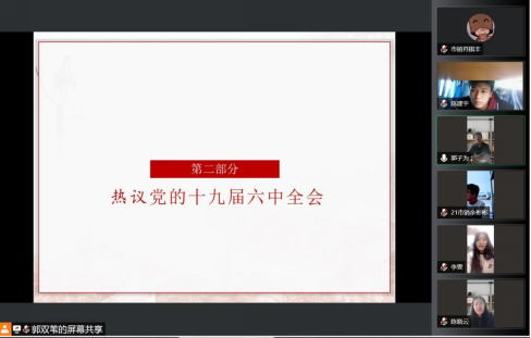 会议分两部分内容,第一部分让同学们通过观看党的十九届六中全会视频了解党的十九届六中全会,第二部分由同学们学习党的十九届六中全会精神,表达认知;最后由郭双苇同学对此次活动进行了总结。