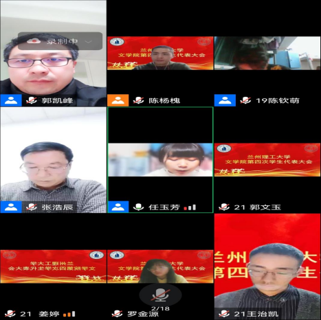 2021年11月20日19:30,文学院在腾讯会议召开“兰州理工大学文学院第四次全体学生代表大会”。学院书记张浩辰、校学生会代表吴冬冬、学院团总支书记郭凯峰、辅导员助理任玉芳、文学院全体学生参加了会议,会议由学院团总支书记郭凯峰主持。
