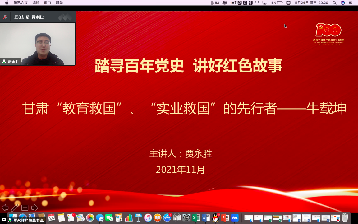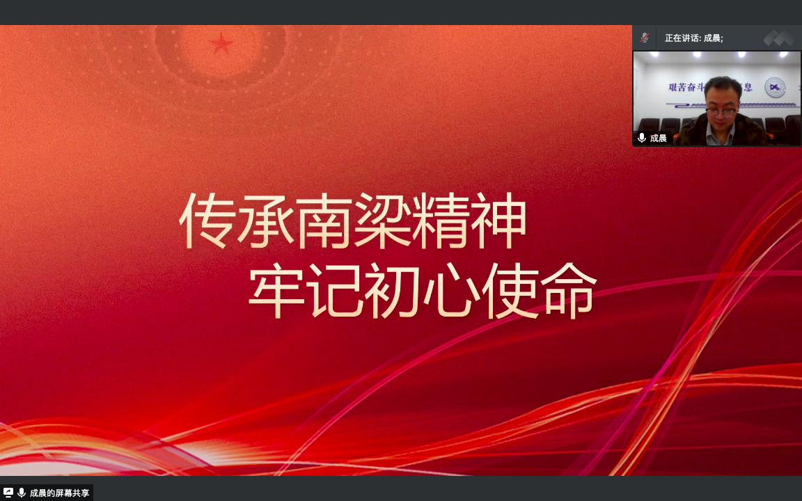 首先,贾老师以“致敬抗疫的兰州·致敬我们的兰州”为主题,通过视频形式回顾兰州理工大学志愿者在疫情面前的奋勇拼搏和无私奉献精神,对奋斗在一线的抗疫工作者表达了崇高的敬意。随后,贾永胜老师讲述“教育救国”、“实业救国”的先行者牛载坤先生的故事,牛载坤先生作为兰州理工大学的首任校长,他“少小励志,勤奋好学;实业救国,多方奔走;教育救国,初心不改”的精神,也正是“红柳”精神的彰显。第二阶段成老师以“传承南梁精神·牢记初心使命”为主题,介绍“面向群众、坚守信念、立党为公、求实开拓”的南梁精神。最后,成老师对在场的每一位青年学生提出“脚踏实地、仰望星空”的期望。
