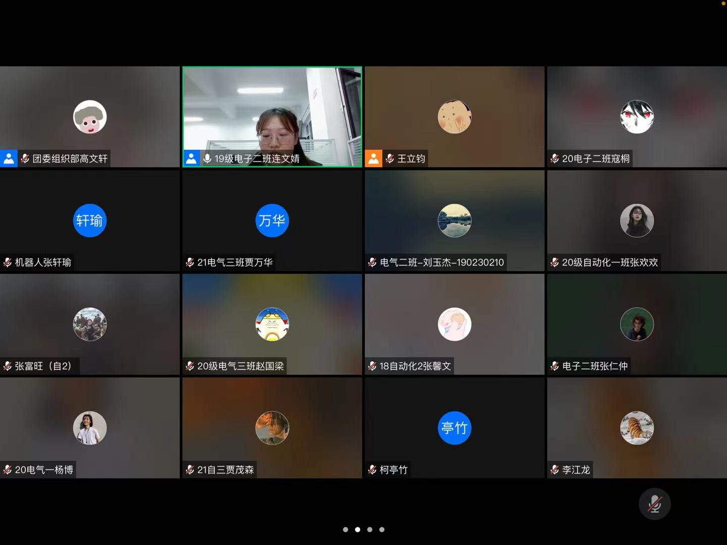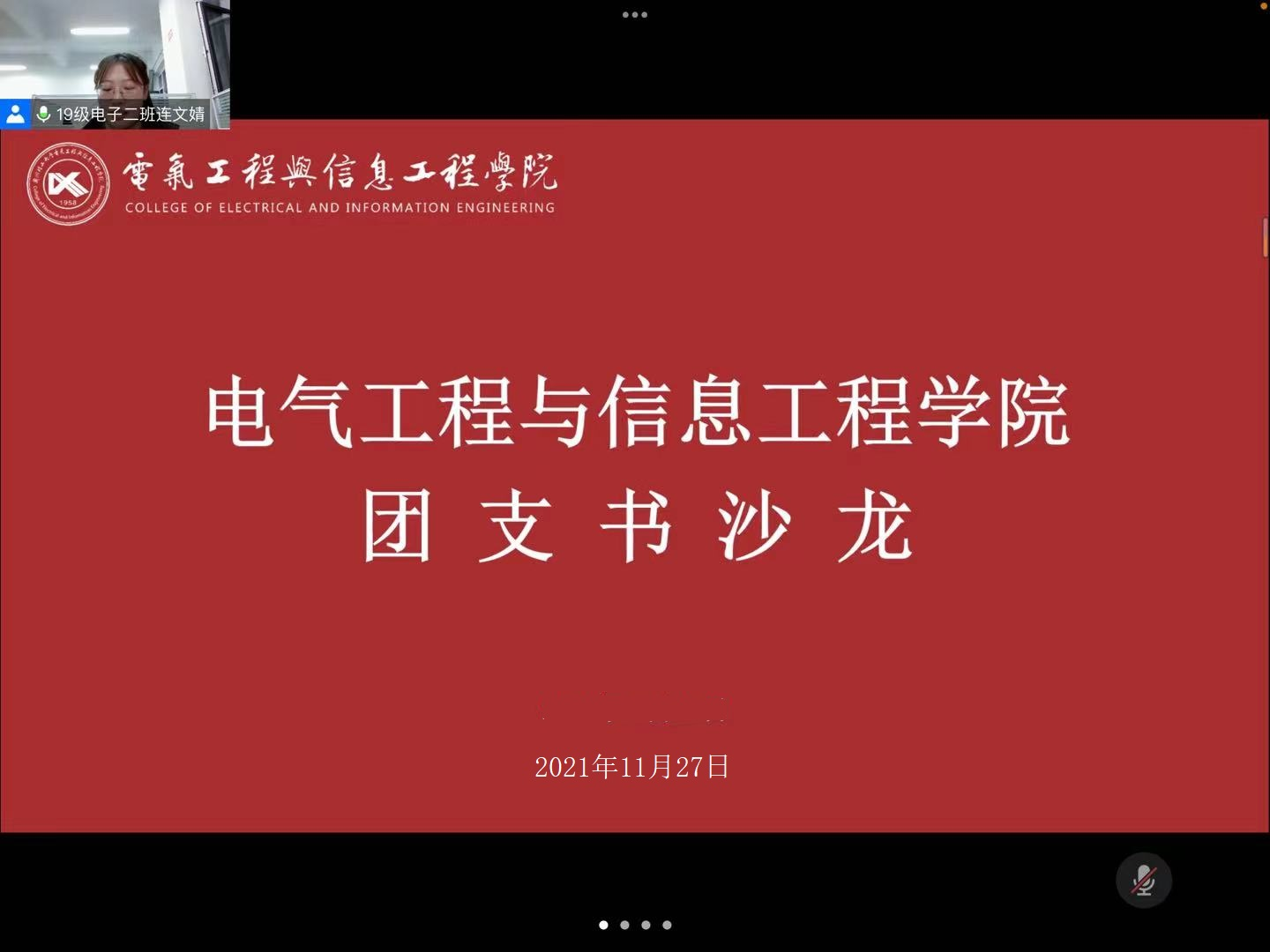 为进一步加强基层团组织规范化建设,提升基层团组织活力,提高团支书的工作能力和业务水平,11月27日电信学院以“夯实工作基础,建立活力支部”为主题开展线上团支书沙龙活动。活动邀请“百年奋进路 扬帆新征程”庆祝建党100周年主题团日活动二等奖获得者电信学院2019级电子信息科学与技术专业2班团支部书记连文婧同学,进行交流分享。学院团委书记成晨,大一、大二、大三以及研一全体团支书参加了活动。