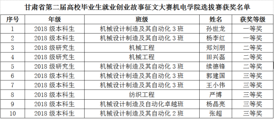 为进一步加强学院就业育人成效,帮助学生提升就业竞争力,树立良好的就业观念,宣传就业典型,分享就业案例,推进就业工作向纵深发展,全面促进全程化就业指导格局,2021年10月20日至11月29日,机电工程学院组织开展甘肃省第二届高校毕业生就业创业故事征文大赛学院选拔赛。