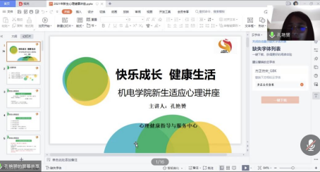 为深入普及心理健康知识,促进学生身心和谐发展,帮助2021级新生尽快适应大学生活,11月30日,机电工程学院利用腾讯会议举行2021级新生入学教育——心理健康教育专题讲座。本次讲座由兰州理工大学心理健康指导服务中心孔艳赟老师主讲,学院心理专项辅导员吕甜子、21级辅导员刘炜琪及2021级全体同学线上观看了本次讲座。