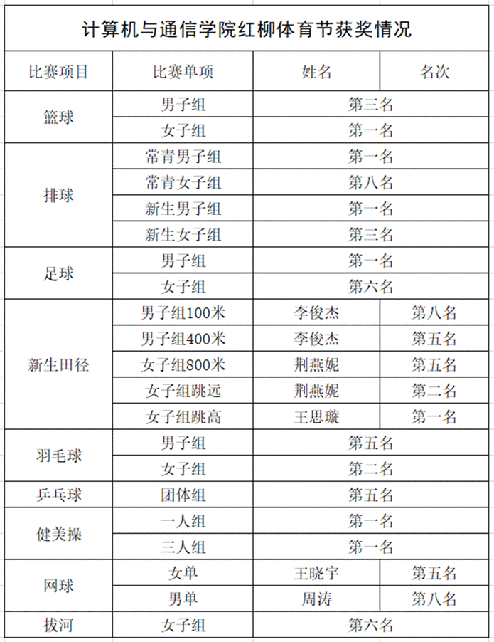 在本届体育节比赛中,学院积极组织学生参与篮球赛、足球赛、排球赛等十三项体育比赛,参与人数超过300余人次。计通学子在各项体育比赛中奋勇争先,顽强拼搏,赛出了风格,赛出了水平,将新时代青年风貌展现在了广阔的体育舞台上。本届红柳体育节中,学院荣获足球男子组第一名,篮球赛女子组第一名,篮球男子组第三名,排球比赛男子组第一名的好成绩。在其他团体和单项比赛中也取得了较好成绩。