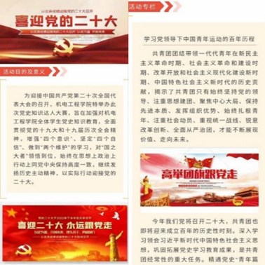 为进一步引导我院广大青年学生继承优良传统、厚植红色基因、强化使命担当,加强对党领导下中国青年运动的百年光辉历程的学习,4月14日—27日,机电学院开展了历时15天的党团知识线上答题大赛。