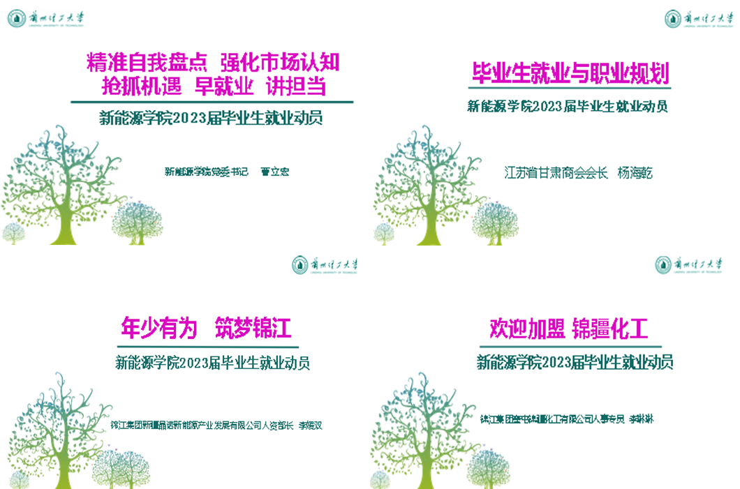 江苏省甘肃商会杨海乾会长以“毕业生就业与职业规划”为题,介绍了江苏省主导产业及新能源行业发展前景,指导同学们做好就业与职业规划,“早启动、早谋划、早准备”,及早理想就业。新疆晶诺新能源产业发展有限公司人资部长李媛双、新疆奎屯锦疆化工有限公司人事专员李琳琳推介了企业发展现状及前景,对2023届毕业生招聘岗位及岗位能力要求进行了介绍,从用人单位角度帮助毕业生全面了解企业对人才岗位胜任力具体需求,引导学生了解职业定位,尽早规划未来。