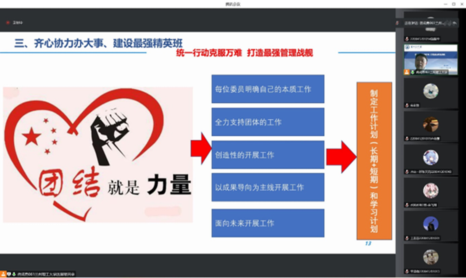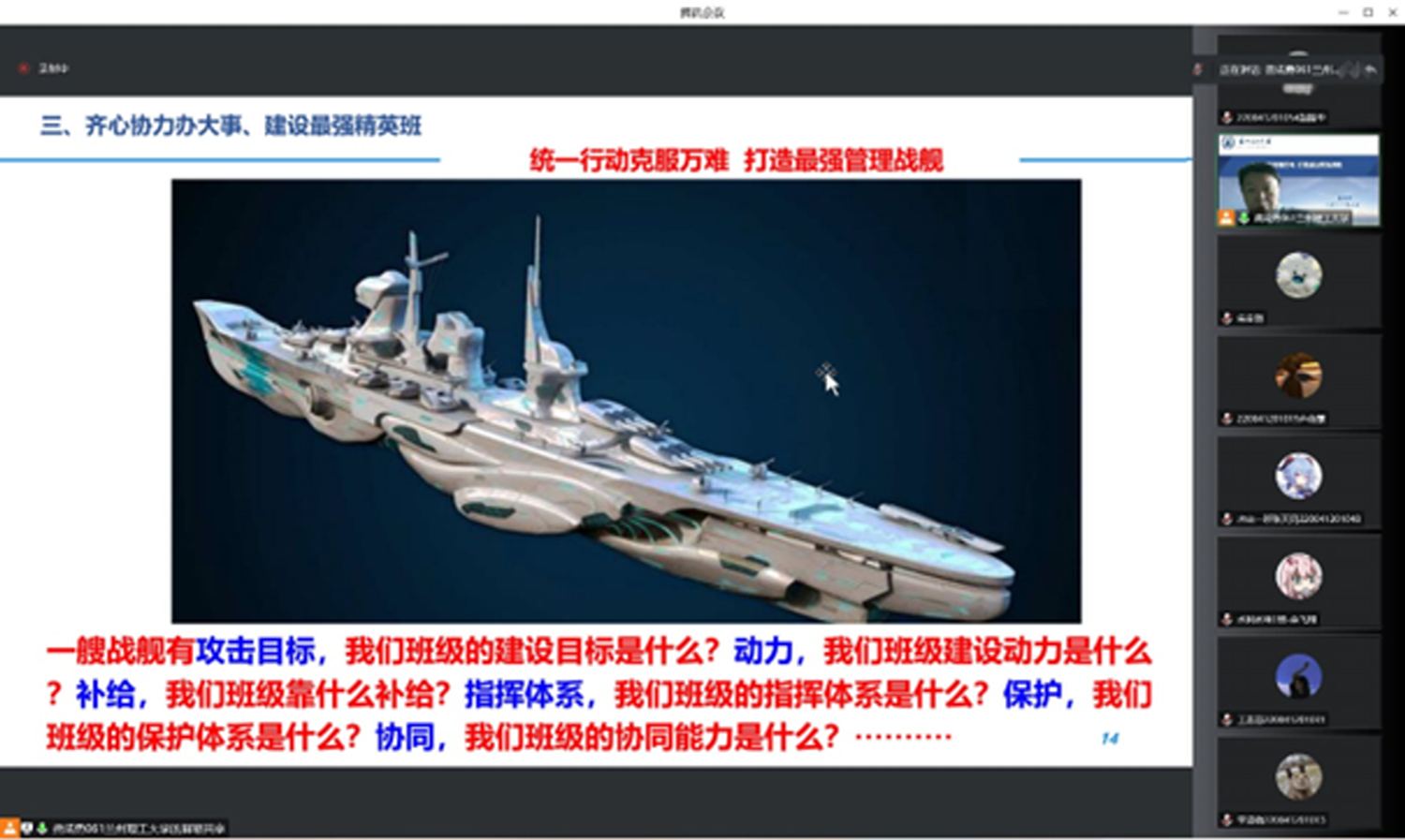 在龚老师主题报告第三个部分,分析班委会成员工作现状,并结合大学生学生干部的工作基本规律,总结学生干部应该具备的基本技能和能力,强调了班委、宿舍长、学科竞赛小组在班级工作中的重要性。并对班级工作做了进一步分析,建议各位参会人员认真领会“团结就是力量”的真实价值和真谛。进一步地,班主任利用比拟的手法,引出班委会建设的最高标准,即打造班级学生自我建设、自我管理、自我服务、自我成才的最强战舰,同通过主战舰属性进行解析班级战舰的基本要素:“一艘战舰有攻击目标,我们班级的建设目标是什么?动力,我们班级建设动力是什么?补给,我们班级靠什么补给?指挥体系,我们班级的指挥体系是什么?保护,我们班级的保护体系是什么?协同,我们班级的协同能力是什么?……”。要求参会人员努力学习,做能服务好班级建设的好卫士。