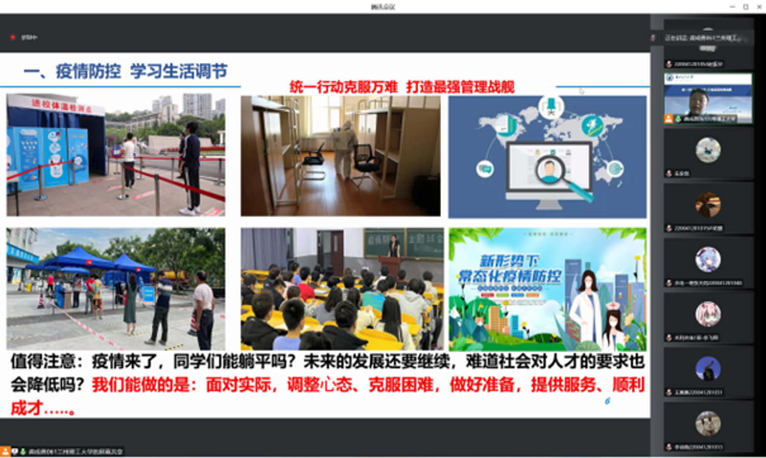 在龚老师主题报告第一个部分,通过人类社会经历灾害与人类与灾害战斗的文明史出发,不论灾害是否被战胜,人类文明的发展总是向前,现代文明今天,中国能更好地战胜面临的疫情,进而强调学校配合国家及地方政府,积极应对疫情,顺利开展各项工作,并向参会人员倡导:“面对实际,调整心态、克服困难,做好准备,提供服务、顺利成才……”。