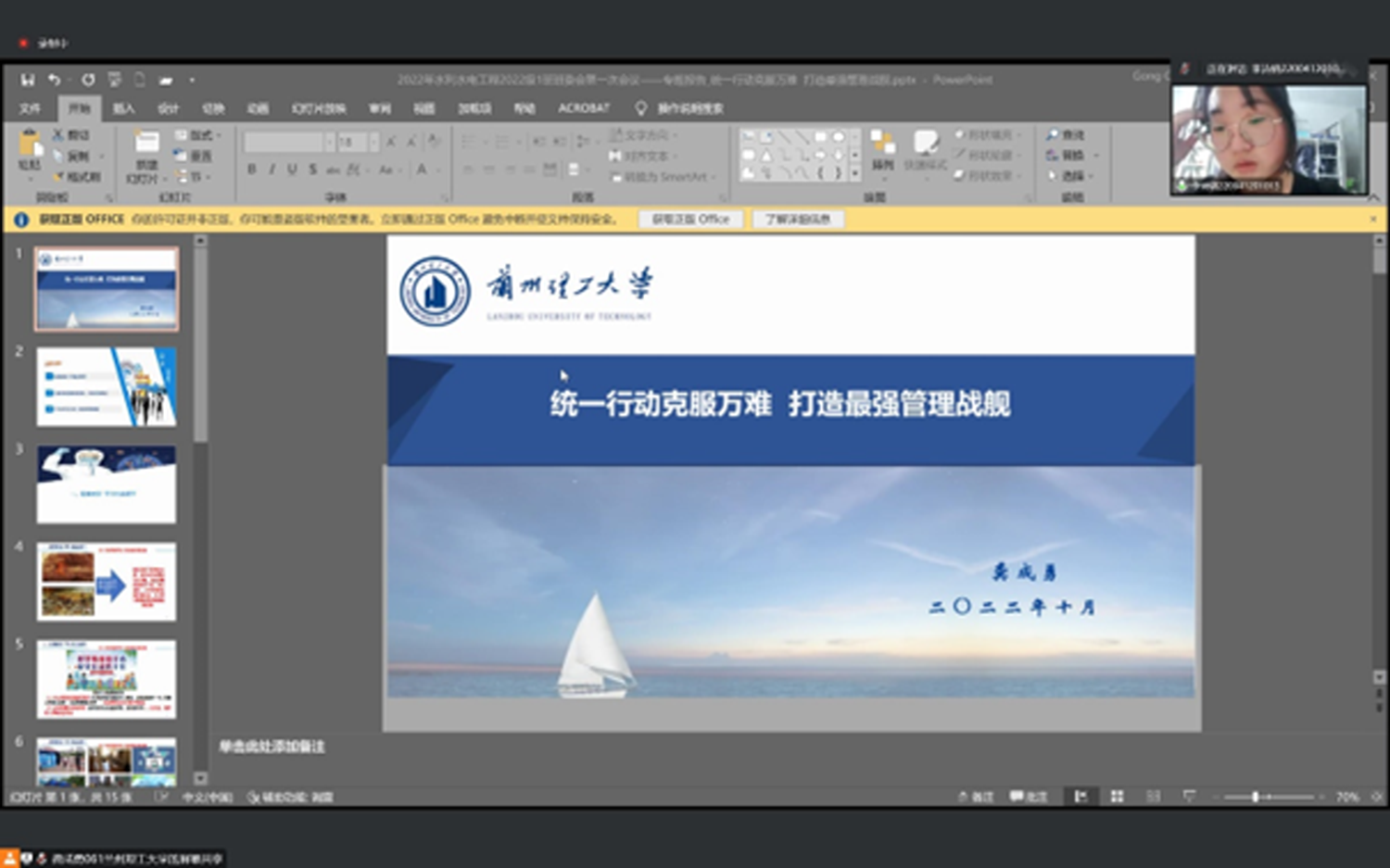 10月8日,水利水电工程2022级1班开展班委会扩大会议,会议主题是理清班委工作思路,为班级同学做好服务。为了应对疫情反弹,确保学生学生学习生活的安全,克服疫情影响新生学习生活状态,加强特殊环境下学生引导和管理,发挥大学生自我管理培养与教育,引导学生遵守大学生行为规范,服从学校学院宿舍管理,同时克服疫情期间造成不适,一方影响新生对大学学习生活的误解,进一步帮助新生开启大学奋进新篇章。会议由班主任龚成勇主持,参会人员包括本班班委会成员、新生宿舍长和学科竞赛兴趣小组负责人共计26人。会议采用在线会议形式,会议包括班委阶段性工作总结及各班委说明近期工作内容、班主任主题报告、重点工作安排与部署等内容。