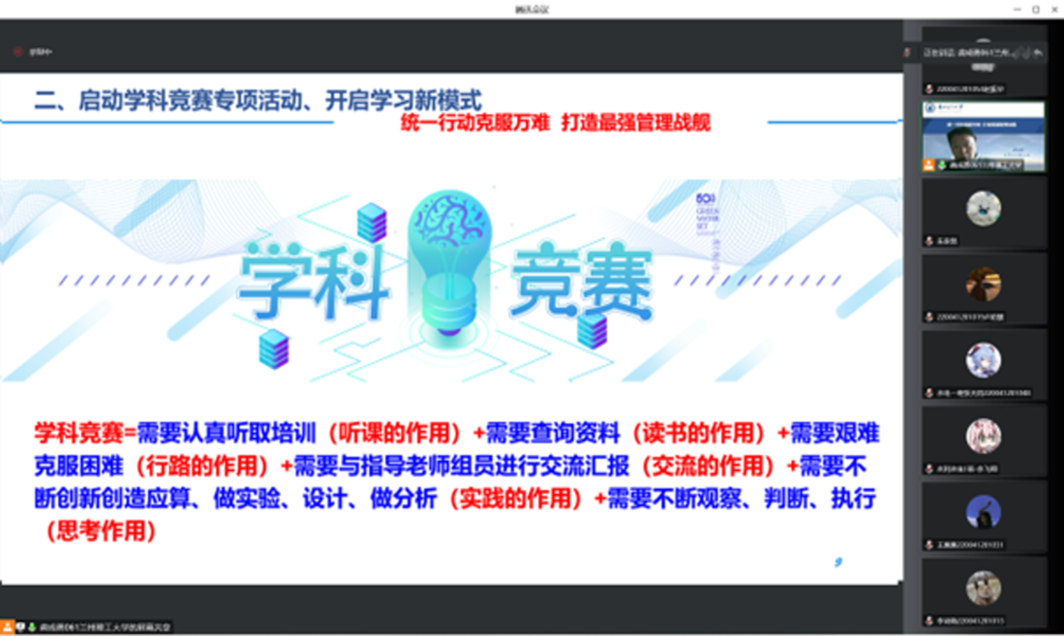 在龚老师主题报告第二个部分,通过介绍大学教育和培养变革与实际,总结了大学学习生活对人才培养的价值和作用,并向参会人员提议思考“我们为什么要通过各种形式学习?进而说明在大学阶段需要投入大量的时间认真认真听课、刻苦学习专业课程的同时,还需要有计划地持续的研读专业书籍,尤其阅读人文精品书籍以获得内在修养的养成,作为自然科学实践的工科专业的同学还需要参加进行实验、设计、交流汇报、社会实践等环节,获得综合能力。最后引出大学生学科竞赛对工科专业的人才培养的是综合性的,其主要表现为:“学科竞赛=需要认真听取培训(听课的作用)+需要查询资料(读书的作用)+需要艰难克服困难(行路的作用)+需要与指导老师组员进行交流汇报(交流的作用)+需要不断创新创造应算、做实验、设计、做分析(实践的作用)+需要不断观察、判断、执行(思考作用)……”。因此班级在以学科竞赛小组为主导开启学科竞赛专项活动,开启班级学习新模式。