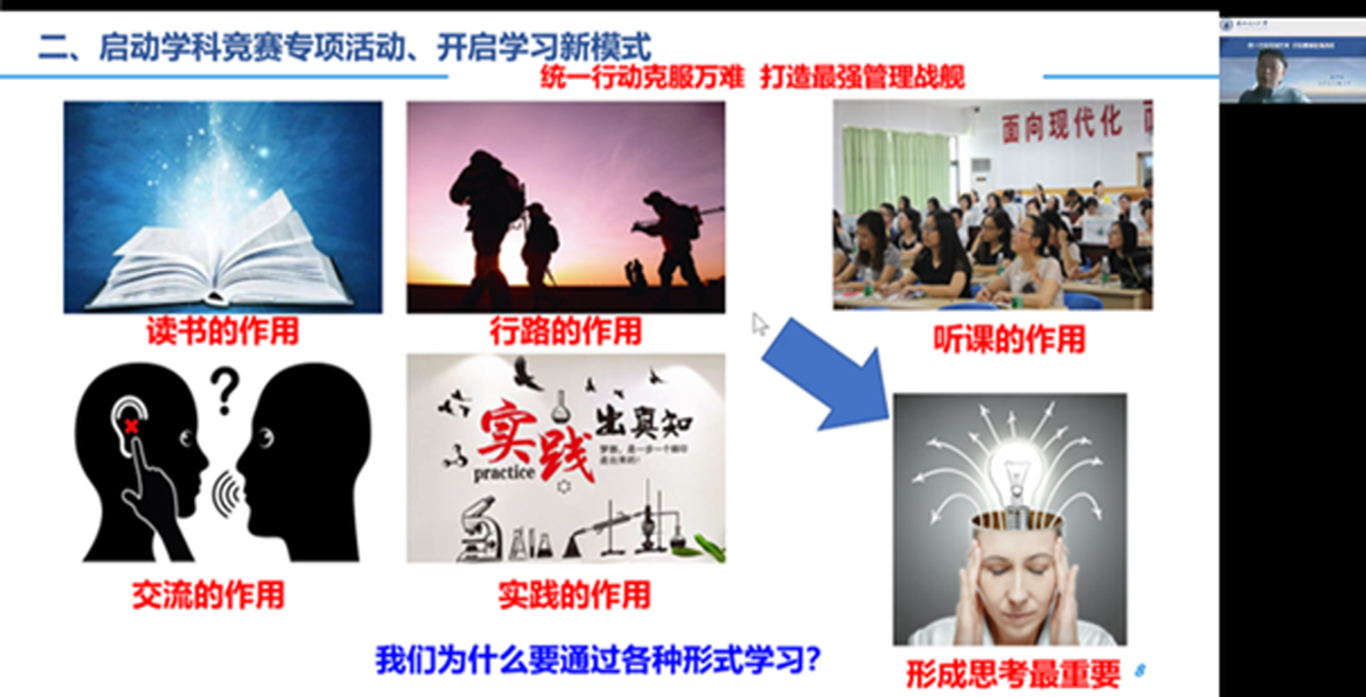 为了培养班委会成员,提高其综合素质,解决上述班委会成员中面对的不足及上述矛盾的解决,班主任龚成勇老师在第二个环节作了“统一行动克服万难,打造最强管理战舰”主题为报告。报告分为三个内容,“疫情防控 学习生活调节”、“启动学科竞赛执行活动,开启学习新模式”和“齐心协力办大事,建设最强精英班”。