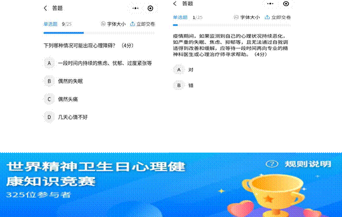 开展心理健康知识宣传活动。为宣传“世界精神卫生日”,促进心理健康知识的普及,倡导健康的生活理念,学院举行了世界精神卫生日知识竞赛活动。竞赛通过线上参加答题活动,在有限时间内完成作答。在答题的过程中,学习相关的心理健康知识,了解世界精神卫生日。活动参与度很高,其中十一名同学获得满分的好成绩。(撰稿:焦婷婷;初审:陈育苗;审核:高国礼)