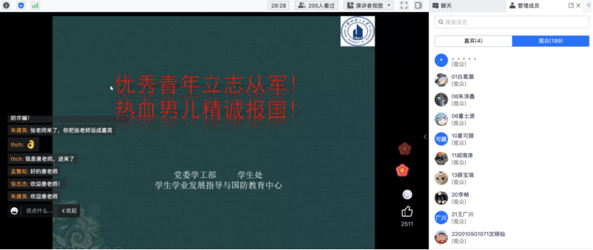 宣讲会上,唐老师以“优秀青年立志从军,热血男儿精诚报国”为主题,根据最新的征兵文件,结合当前征兵工作的新形势、新特点,详细介绍了大学生参军意义、应征条件、入伍流程、优待政策等具体内容,一一解答了大家关注的各类热点问题,并勉励同学们要心怀家国梦想、树立责任担当,积极响应国家号召,带着青春梦想投身军营、报效祖国,为建设现代化人民强军奉献青春热血。