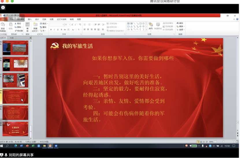 “国无防不立,民无军不安”。为进一步贯彻落实征兵入伍相关政策,激发学生参军入伍热情,1月15日下午,材料学院通过腾讯视频会议召开了国防教育暨应征入伍宣讲活动。此次宣讲会由校学生处学生学业发展指导与国防教育中心唐洪川老师主讲,2020级优秀退役学生代表、2022级全体新生参加会议。