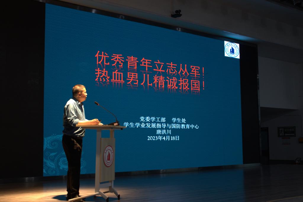 唐洪川老师详细解读了国家、甘肃省以及学校大学生征兵入伍政策,鼓励有为青年立志从军,热血男儿精忠报国。他号召同学们积极响应祖国号召,踊跃参军报国,把青春梦融入强军梦,在推进强军梦的征程中,为实现中国梦贡献自身力量。他讲到,大学生是国家的宝贵人才资源,征集大学生参军入伍,既是建设巩固强大军队的迫切需要,也是服务经济社会发展和维护国家长治久安的客观要求,是一项利国利民的大事好事。