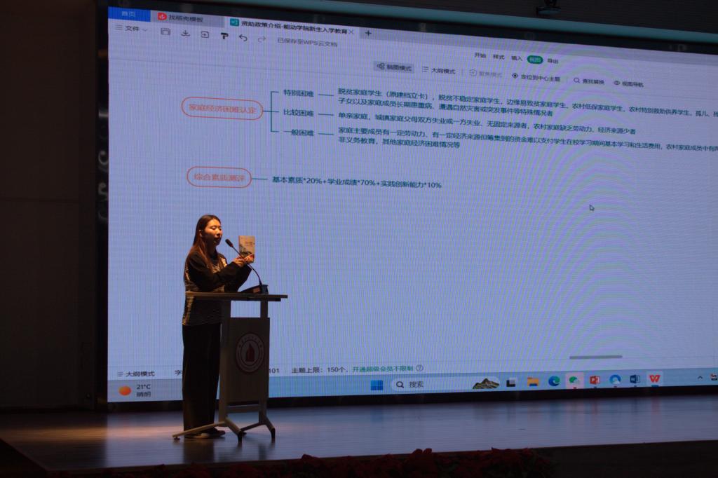张慧琴老师向同学们详细介绍了国家相关资助政策、国家奖学金、国家励志奖学金、国家助学金评定流程及申请条件。张老师希望同学们在大学期间好好学习,奋发图强,力争获得国家级各类奖学金,并鼓励同学们要不断提升自身能力,努力实现人生价值。