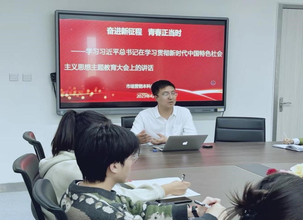 2023年4月19日下午,市场营销本科生党支部召开会议,学习习近平总书记在新时代中国特色社会主义思想主题教育大会上的讲话,并按照学校、学院关于召开学习贯彻习近平新时代中国特色社会主义思想主题教育动员部署会的相关要求做好安排。会议由支部书记贾永胜主持,全体党员参会。